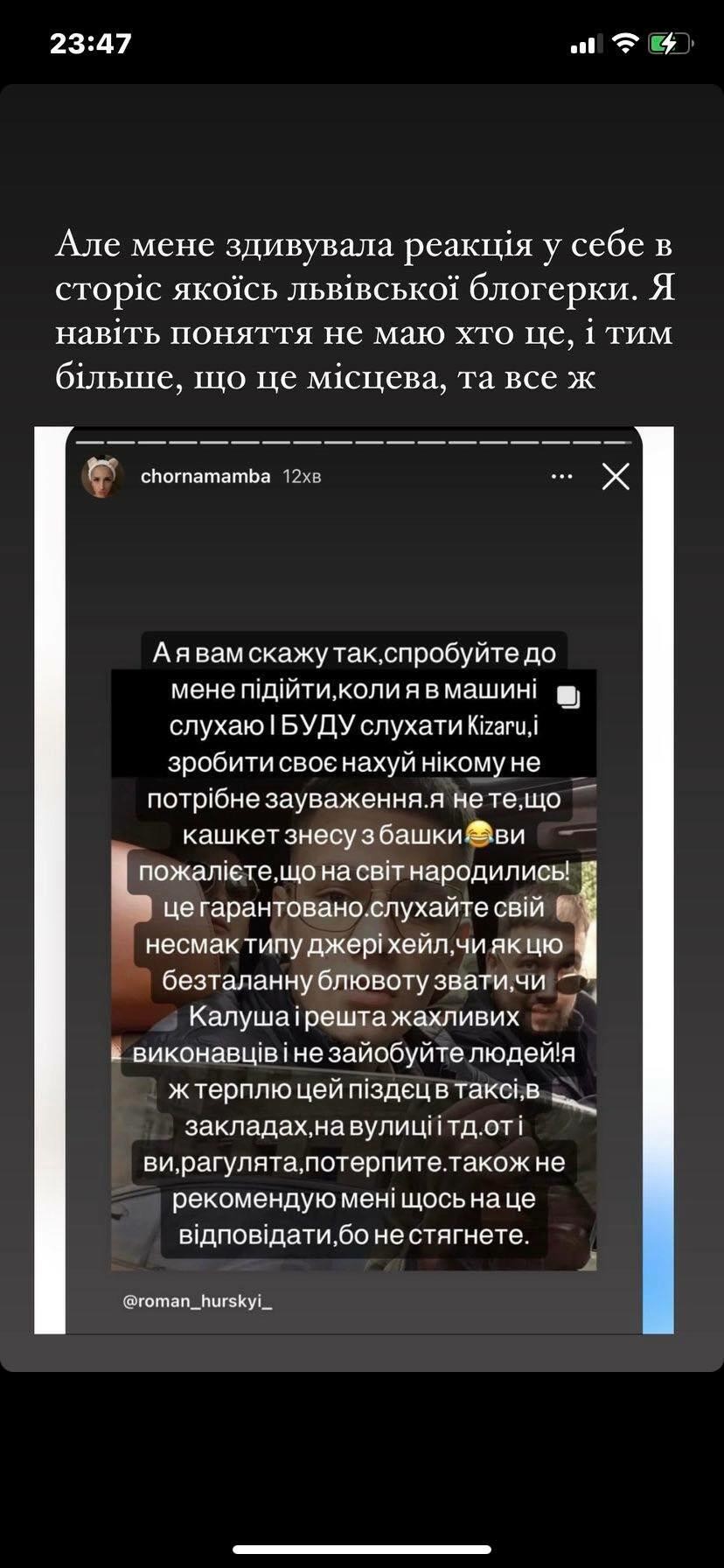 "Вам скажу так, спробуйте до мене підійти коли я в машині слухаю і буду слухати Kizaru, і зробити своє нах*й нікому непотрібне зауваження. Я не те, що кашкет знесу з башки, ви пожалієте, що на світ народились. Слухайте свій несмак типу Джері Хейл, чи як цю безталанну блювоту звати чи Калуша…не за*обуйте людей, я ж слухаю цей пі*дец в таксі і на вулиці", – написала в сторіс дівчина.