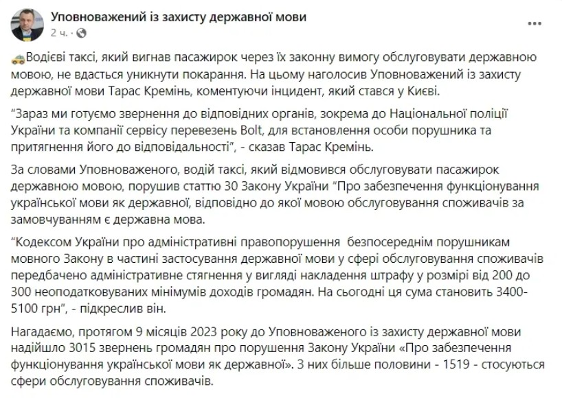 За його словами, водій таксі, який відмовився обслуговувати пасажирок державною мовою, порушив закон. Згідно з КУпАП порушнику загрожує адміністративне стягнення у вигляді накладення штрафу у розмірі від 200 до 300 неоподатковуваних мінімумів доходів громадян. На сьогодні ця сума становить 3400–5100 грн.