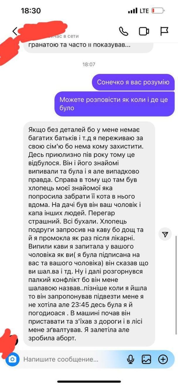 “...Пізніше, коли я йшла, то він запропонував підвезти мене. Я не хотіла, але 23:45 десь була, я й погодилася. В машині він почав приставати та з’їхав з дороги, і в лісі мене зґвалтував. Я залетіла, але зробила аборт”, – йдеться у повідомленні жінки, яка захотіла залишитися анонімною.