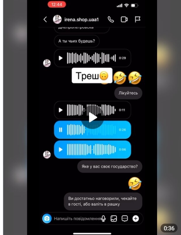Мешканка Луцька на ці повідомлення відповіла коротким "лікуйтеся". На що Ірина написала ще три повідомлення. У них говорилося, що Дніпро, Харків та Одеса російські міста і щоб ці міста дівчина не чіпала.