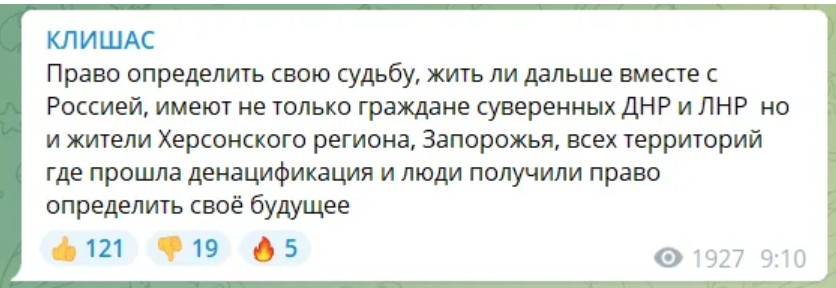 "Право визначити свою долю, чи жити далі разом з Росією, мають не лише громадяни суверенних ДНР та ЛНР, а й жителі Херсонського регіону, Запоріжжя, всіх територій де пройшла денацифікація та люди отримали право визначити своє майбутнє", - написав рашист у своєму Telegram- канал.