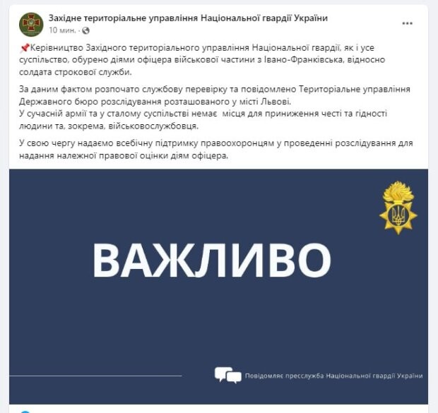 Такі дії, схоже, спровокували командира на рукоприкладство. Також вже є інформація, що цей інцидент стався у навчальному центрі Національної гвардії України у місті Івано-Франківськ, ще 26 березня поточного року.