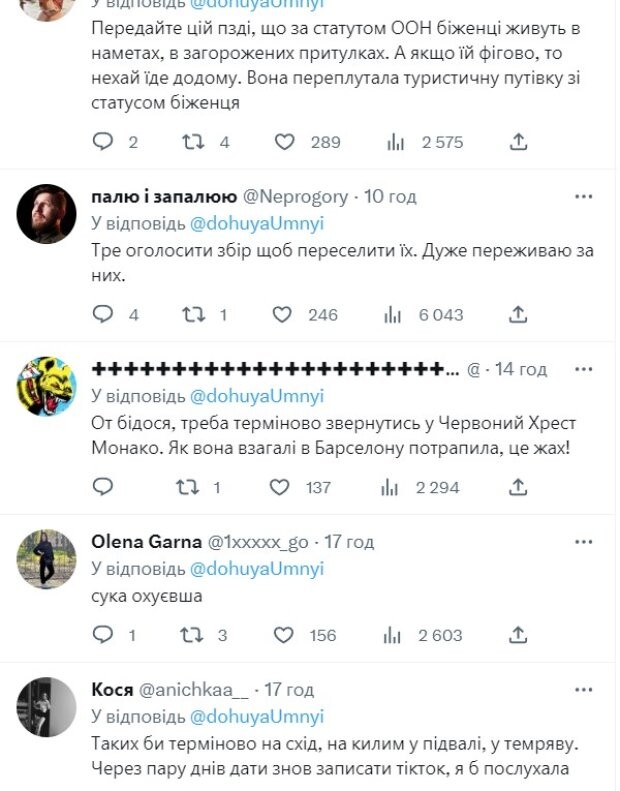 "Передайте, що за статутом ООН біженці живуть в наметах, в загорожених притулках. А якщо їй фігово, то нехай їде додому. Вона переплутала туристичну путівку зі статусом біженця",
