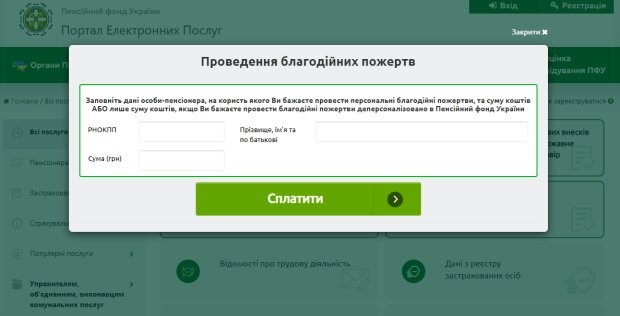 Зробити благодійний внесок можна через веб-портал електронних послуг Пенсійного фонду:
