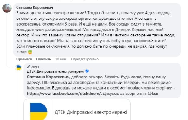 "Значить достатньо електроенергії? Тоді поясніть, чому вже 4 дні поспіль відключають цю саму електроенергію, якої достатньо? А сьогодні в неділю відключили 3 рази. І ще не дали. Ми знаходимося в Дніпрі, Кодаки, приватний сектор. І ми по вашому козли відпущення?" - обурилася вона.