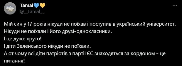 Однак у мережі Х (Twitter) користувач під ніком Tamal, який позиціонує себе, як український патріот написав: "Мій син у 17 років нікуди не поїхав і вступив до українського університету. Нікуди не поїхали і його друзі-однокласники. І це дуже круто!" І діти Зеленського нікуди не поїхали. А ось чому всі діти патріотів із партії ЄС перебувають за кордоном – це питання!"