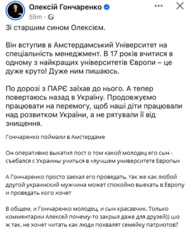 Гончаренко додав, що мав можливість побачитися із сином, коли повертався із ПАРЄ в Україну. Свою посаду нардеп розмістив у Telegram-каналі. Щоправда, можливість коментування прибрав, напевно, щоб не нарватися на критику передплатників.