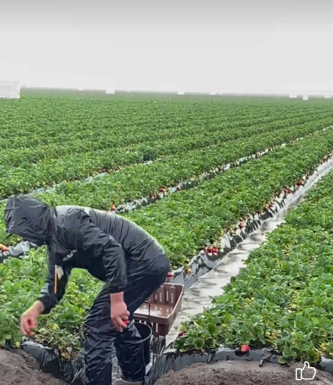 Робітники рвуть полуницю, знаходячись по коліна в воді. Праця проходить під час дощу, який ллє наче з відра.