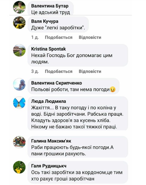 Одна з коментаторок пише, мовляв, її донька, перебуваючи за кордоном на таких заробітках, а саме у Польщі, місяць лікувала легені, бо застудилась під час збору ягід. Під відео й інші коментарі очевидців, які зазнали такої праці. Також вони пишуть до тих, кому здається, що люди, які заробляють в таких умовах, отримують бозна які зарплати, що вони теж можуть спробувати "гнути спини", як і решта заробітчан.