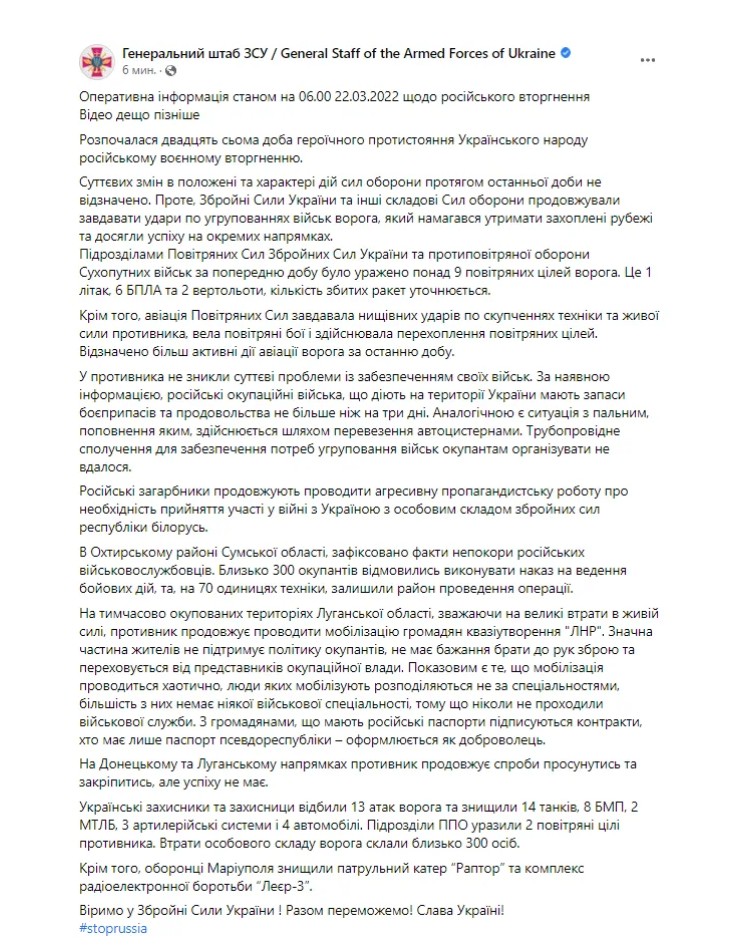 Про це йдеться у зведенні Генштабу ЗСУ на ранок 22 березня. Водночас Збройні сили України зуміли досягти успіху на окремих напрямках.