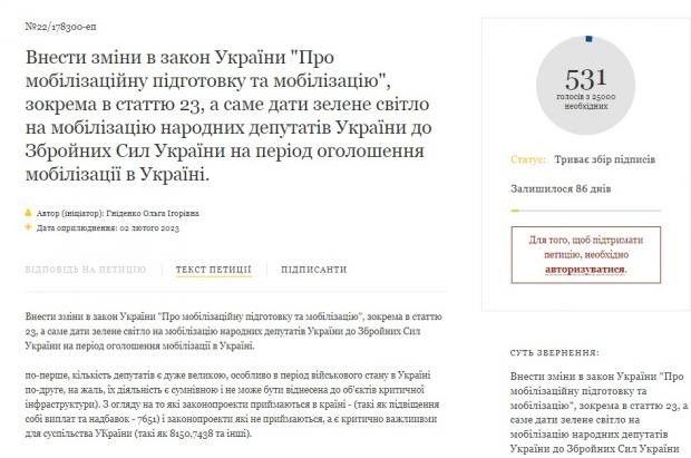 “Внести зміни в закон України “Про мобілізаційну підготовку та мобілізацію”, зокрема в статтю 23, а саме дати зелене світло на мобілізацію народних депутатів України до Збройних Сил України на період оголошення мобілізації в Україні”, – пропонує авторка петиції.