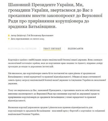 Визнання корупції державною зрадою та рівносильна правова відповідальність для корупціонерів та зрадників Батьківщини – важливий крок у боротьбі з корупцією та зміцненні національної безпеки України”, – було написано у петиції.