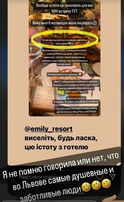 У своєму блозі Вікторія зауважила, що її вигнали з Emily Resort, який знаходиться у Винниках, "прямо з басейну і з мокрою головою".