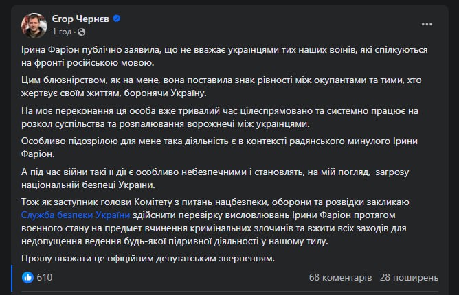 Народний депутат і заступник голови оборонного комітету Верховної Ради Єгор Чернєв закликав Службу безпеки України здійснити перевірку висловлювань ексдепутатки, мовознавиці Ірини Фаріон протягом воєнного стану на предмет вчинення кримінальних злочинів та вжити всіх заходів для недопущення ведення будь-якої підривної діяльності у тилу. Відповідний пост він опублікував у Facebook.
