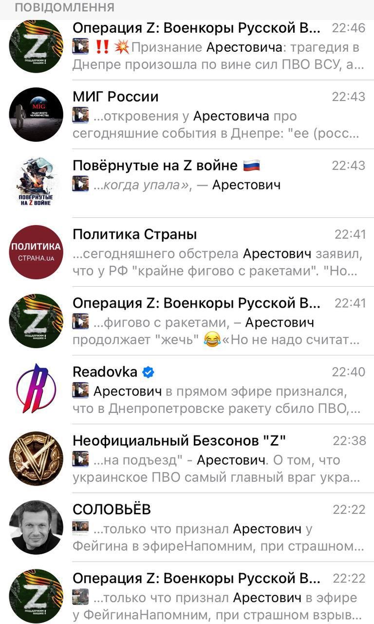 Натомість слова Арестовича одразу стали знаряддям російської пропаганди, котра після трагедії в Дніпрі заявила, нібито будинок на Набережній Перемоги в Дніпрі зруйнувала не російська ракета, а зенітна ракета ППО ЗСУ.