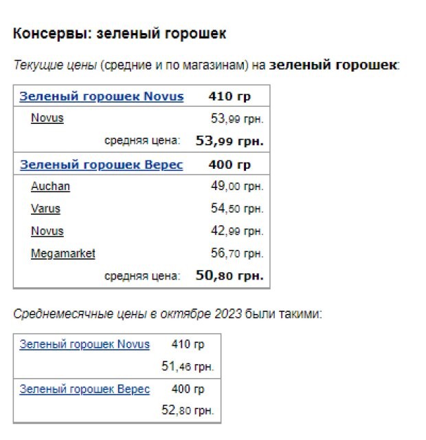 Для порівняння, ця ж 400-грамова баночка у жовтні коштувала 52,80 гривні. У листопаді 2022 року середній цінник на цей горошок становив 37,66 гривні.