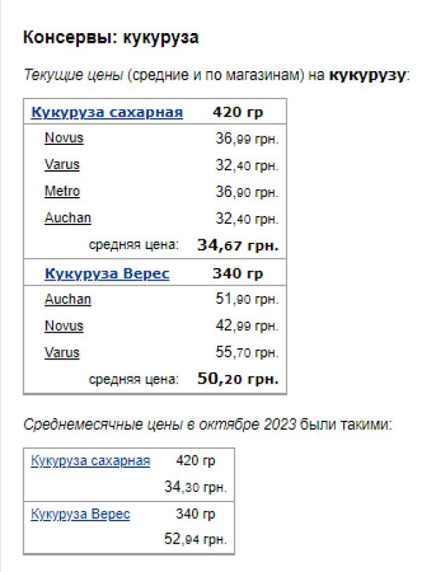 Середній цінник на кукурудзу "Верес" знизився з 52,94 до 50,20 гривні за 340-грамову баночку. У супермаркетах ціни варіюються від 42,99 до 55,70 грн. Роком раніше цю кукурудзу можна було купити за 41,02 гривні за баночку.