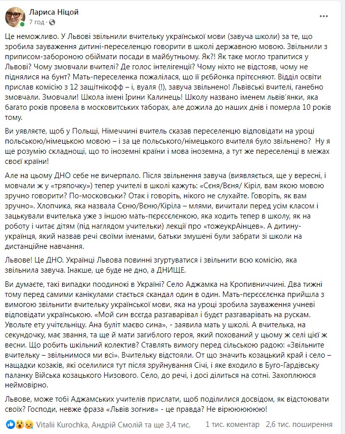 Ви уявляєте, щоб у Польщі, Німеччині вчитель сказав переселенцю відповідати на уроці польською/німецькою мовою – і за це польського/німецького вчителя було звільнено? Ну я ще розумію складнощі, що то іноземні країни і мова іноземна, а тут же переселенці в межах своєї країни!» – написала письменниця.
