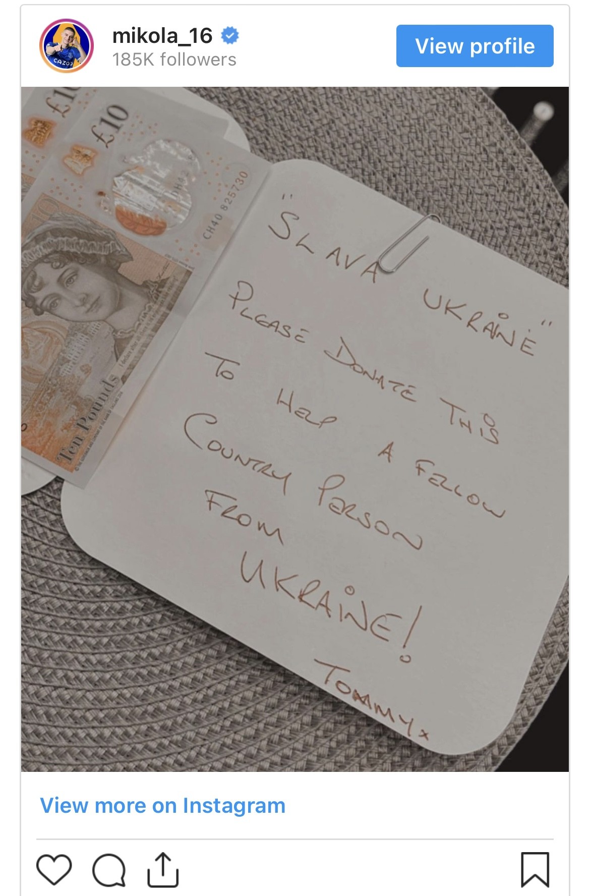 Хочу ще раз подякувати цьому чоловіку з великим серцем, який намагається допомогти моїй рідній країні та всім людям, які небайдужі", - написав Миколенко в Instagram, показавши фото листа з грошима.