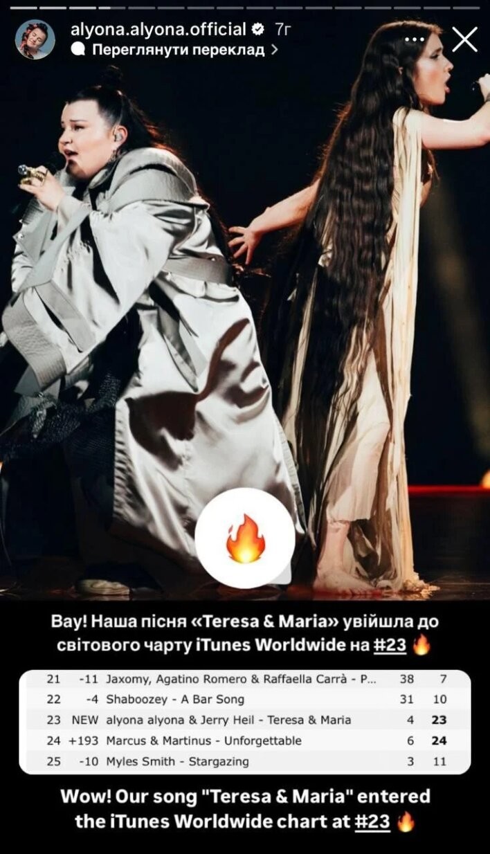 Цей музичний тандем зацікавив слухачів не лише в ефірі конкурсу, а й на міжнародному рівні. "Teresa & Maria" потрапила до звітного світового чарту iTunes Worldwide, розташувавшись на 23 позиції серед 200 найпопулярніших композицій. Це досягнення ще більше вражає, враховуючи, що український дует здійснив винятковий постріл, обігнавши навіть відомих на увесь світ артистів, таких як Тейлор Свіфт та Loreen.