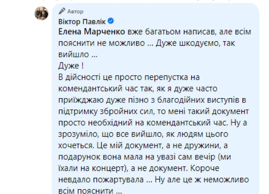 "Вже багатьом написав, але всім пояснити неможливо. Дуже шкодуємо, що так вийшло. Дуже! Насправді це просто перепустка на комендантську годину, тому що я дуже часто приїжджаю дуже пізно з благодійних виступів на підтримку Збройних сил, то мені такий документ просто необхідний на комендантську годину. Ну а зрозуміло, що все вийшло, як людям цього хочеться. Це мій документ, а не дружини, а під подарунком вона мала на увазі саму поїздку через міст, а не документ. Коротше, невдало пожартувала… Але це ж неможливо всім пояснити", – прокоментував виконавець.